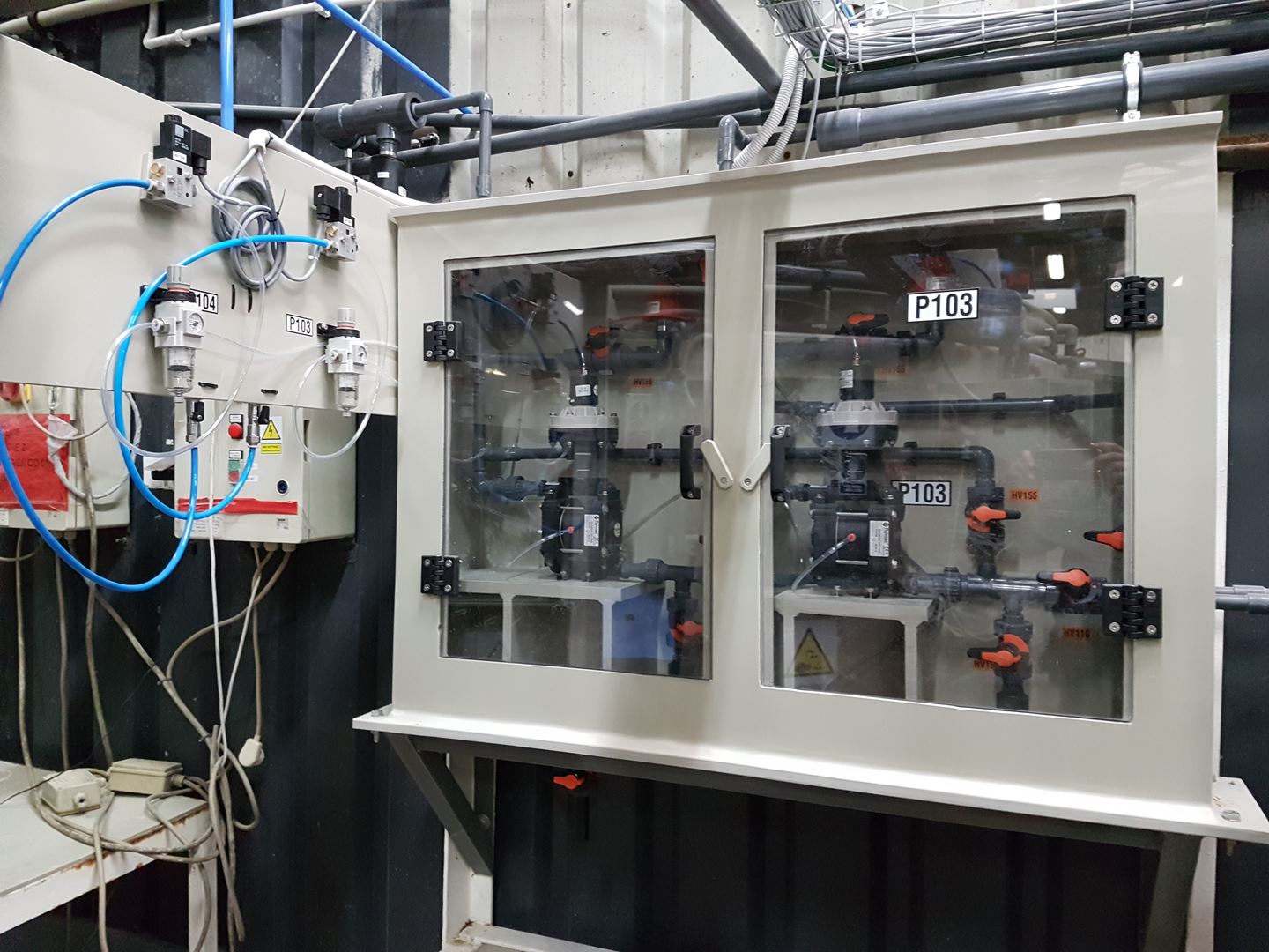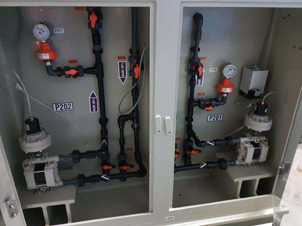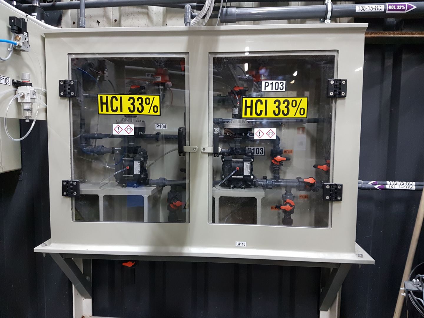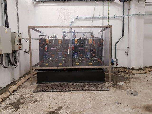 Nachfolgend präsentieren wir die Fotos von unserem Projekt die Anlage zum Dosieren und Lagern von chemischen Medien: HCl und NaOH. Die Anlage enthaltet sowohl ein- als auch doppelwandige Rohrleitungen sowie isolierte Rohrleitungen, die zusätzlich mit elektrischen Heizstrecken ausgestattet ist.